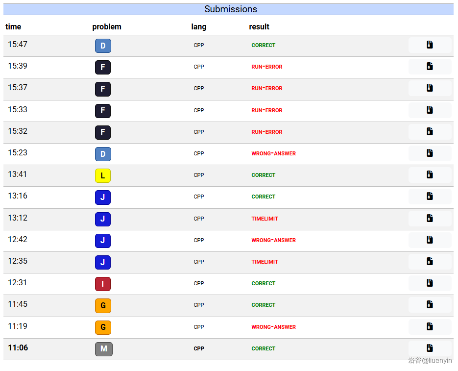 11点开题,欸,怎么502了。疯狂refresh,点M题,打不开,L也打不开,K终于打开了。好难好难。11:04终于打开M了。随后研究了1min如何提交代码,11:06过M。